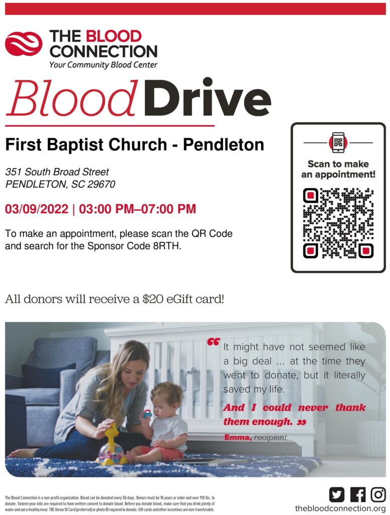 The Blood Connection bloodmobile will be in the parking lot of First Baptist Church of Pendleton on Wednesday, March 9 from 3 – 7 pm. You can walk-in or schedule an appointment using the QR code or this link to The Blood Connection website.
