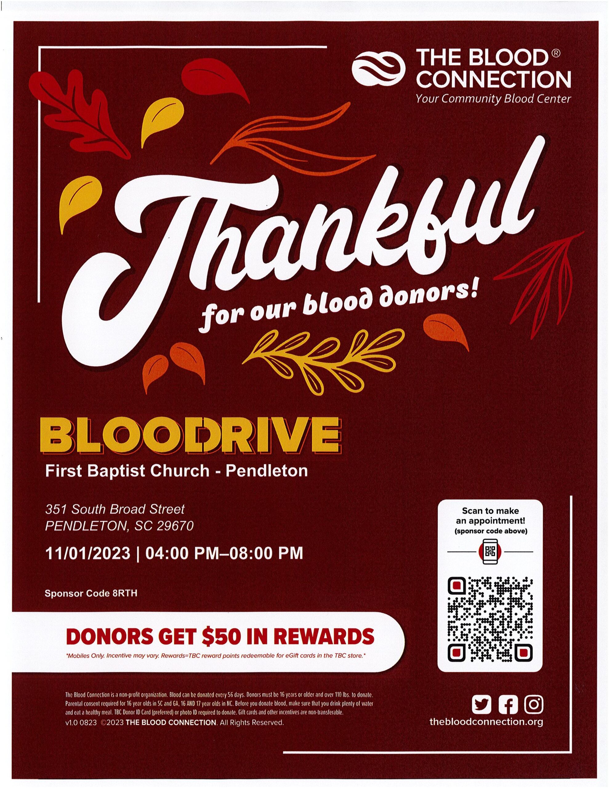 First Baptist Church of Pendleton will host a blood drive on Wednesday, November 1. The Blood Connection will have a bloodmobile in the parking lot from 4:00 – 8:00 pm to accept whole blood donations. Save a life — there is no substitute for blood.