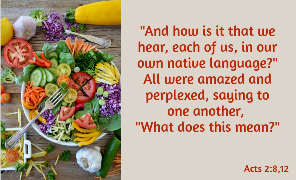The Call to Worship will be “We Pray Now to the Holy Spirit.” Rev. Jennifer McClung Rygg will lead the Passing of the Peace. The Hymn of Praise will be “10,000 Reasons (Bless the Lord).” We will recognize and bless our high school graduates: Beth Brewer, Cheyenne Posey, Brady Taylor, and Drew Westmoreland. Tillman Cantrell, Aniya Webb, Cheyenne Posey, and Beth Brewer will read Acts 2:1-8, 11b-21. The Offertory Hymn will be “Holy, Holy, Holy.” Cheyenne Posey will give the Offertory Prayer. Richard Reynolds Huss will play “O for a Thousand Tongues to Sing” for the Offertory. Rev. Chris Cottingham will sing “A Prayer for Grace.” Rev. Jennifer McClung Rygg will preach the sermon “A Salad Bowl Church.” The Hymns of Response will be “Spirit of the Living God” and “Sweet, Sweet, Spirit.”